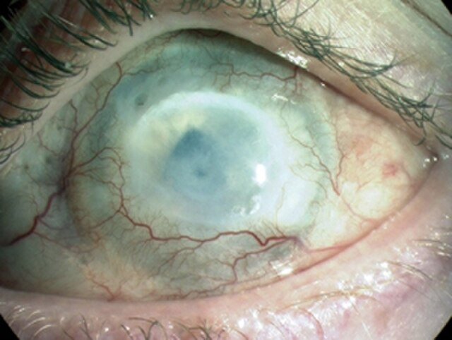 On inspection, the eye appears unusually pale, and tearing is minimal.