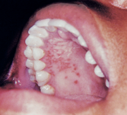 On examination, he is alert and speaking in full sentences. Temperature is 38.4°C. There is tender cervical lymphadenopathy. Oropharyngeal examination shows an erythematous pharynx with patchy exudate. The accompanying image is provided :